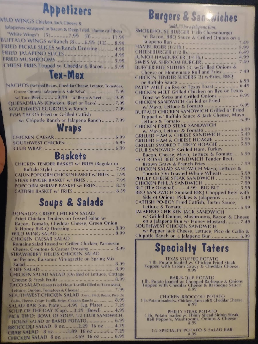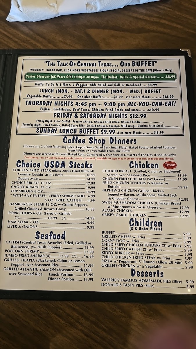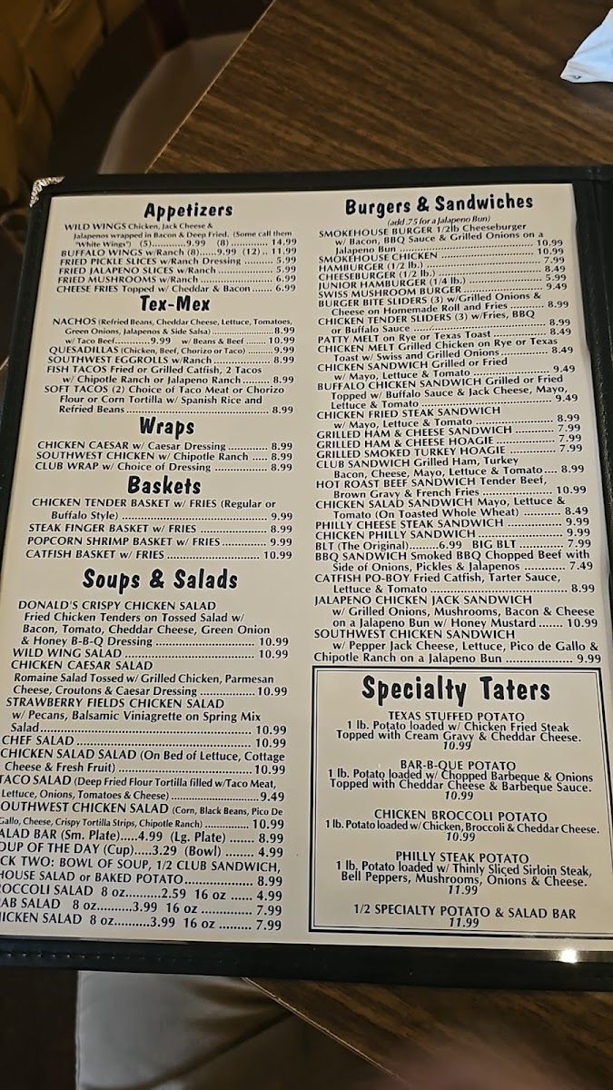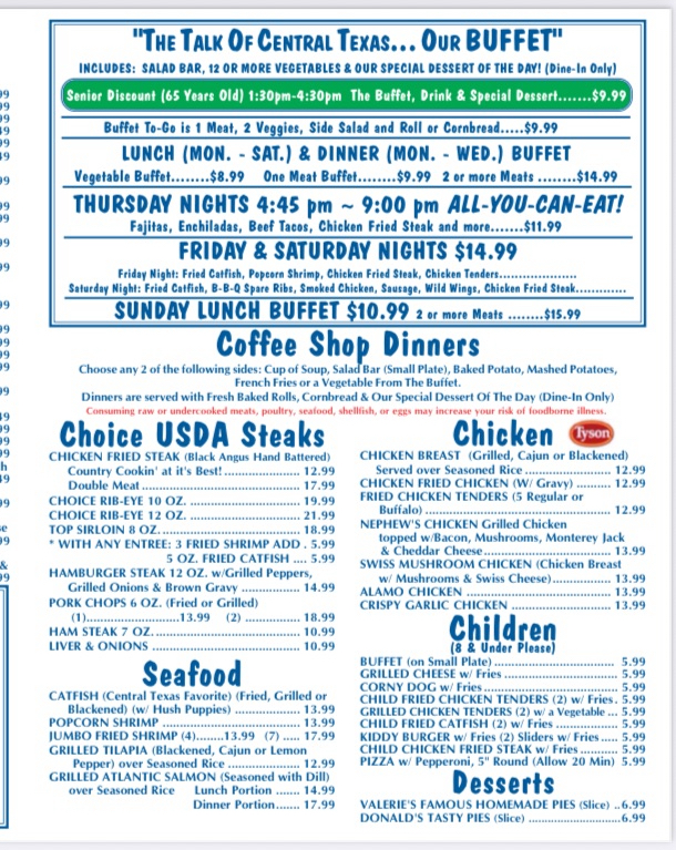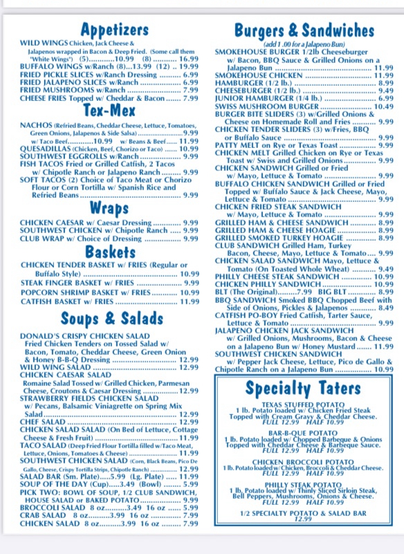 Friday Night: Fried Catfish, Popcorn Shrimp, Chicken Fried Steak, Chicken Tenders. Saturday Night: Fried Catfish, B-B-Q Spare Ribs, Smoked Chicken, Sausage, Wild Wings, Chicken Fried Steak.